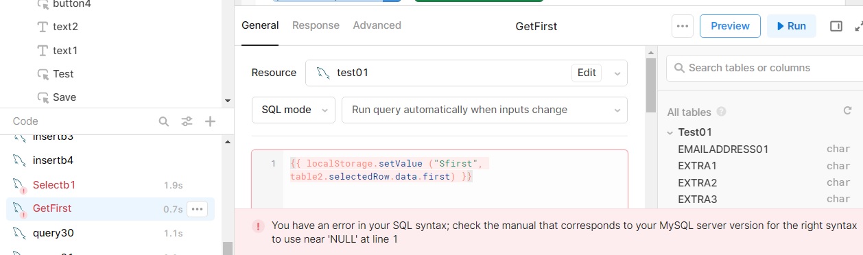 I am trying to store the first name of a selected customer. The array name is table2. I want the stored value to be named "Sfirst".
