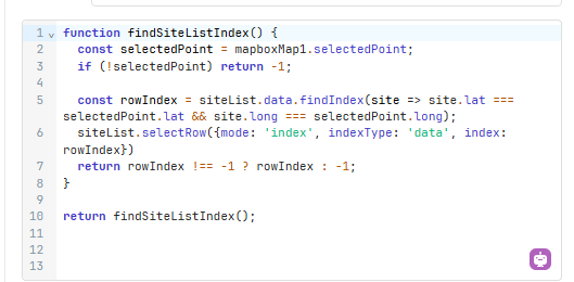 I have the following code which sort of works. Selecting a point on the map highlights it dark red, the table row selects, then the colour on the map reverts. Selecting it again makes the point highlight permanent