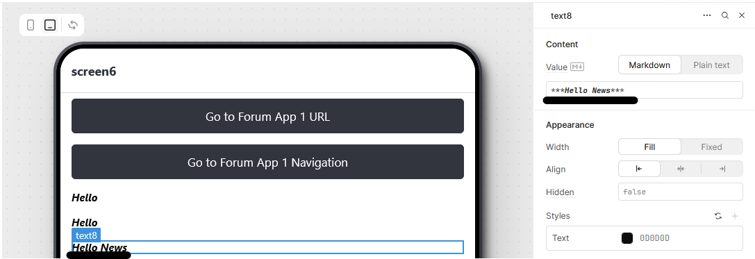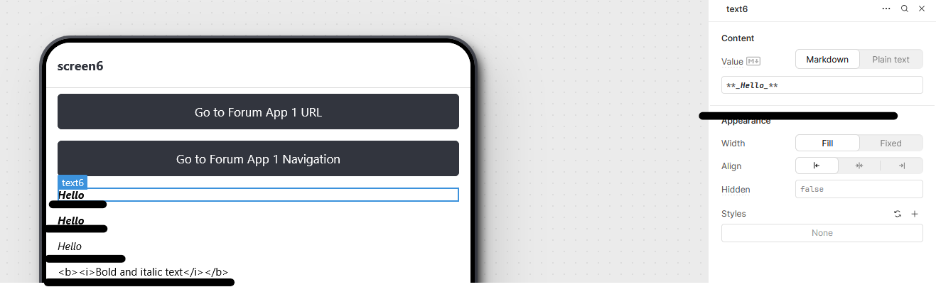 In my case, using HTML tags inside the Text component's Markdown field doesn't seem to work on mobile—it might be a bug. Interestingly, the same HTML works fine in the web app.