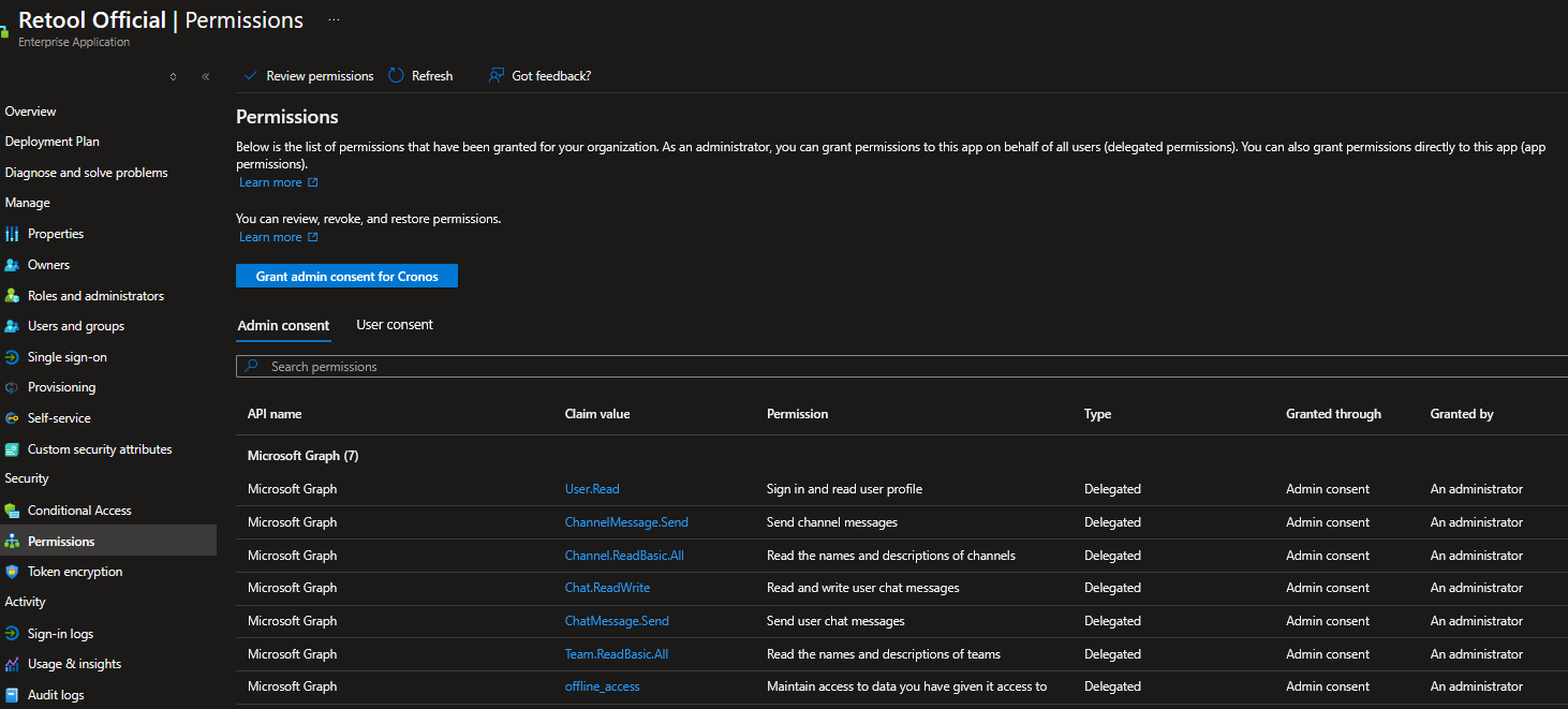 Confirmed admins granted consent for ChannelMessage.Send