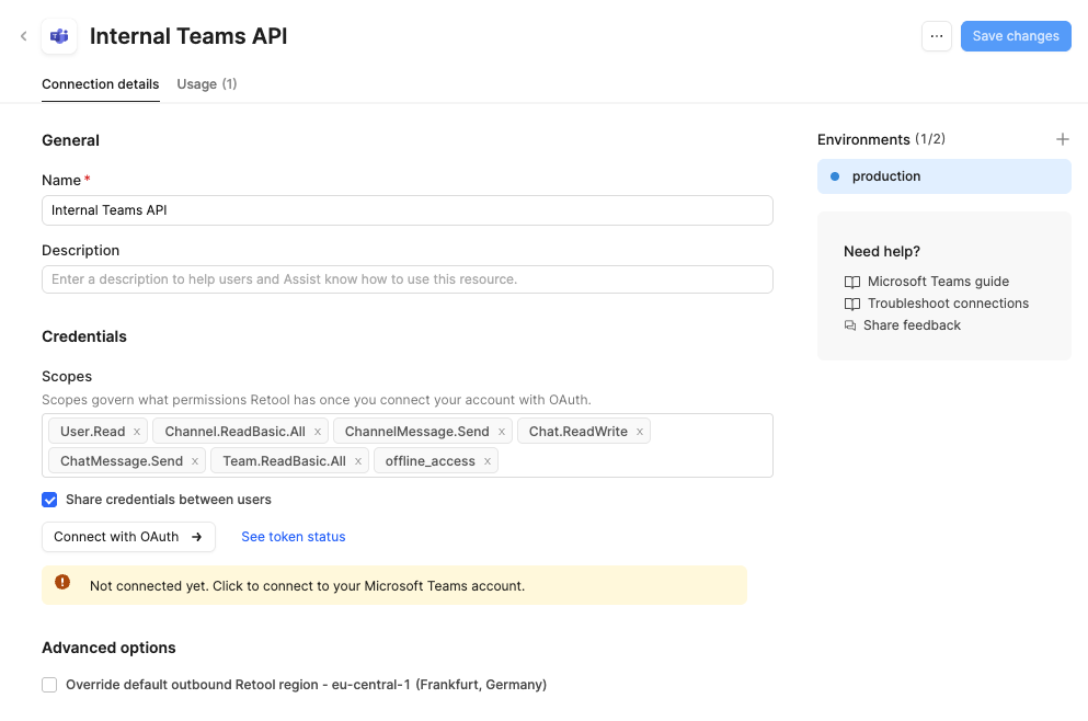 I’m trying to set up a Microsoft Teams connection in Retool via the Microsoft Teams resource (OAuth). The goal is simple: post a message to a specific Teams channel on a Retool event.