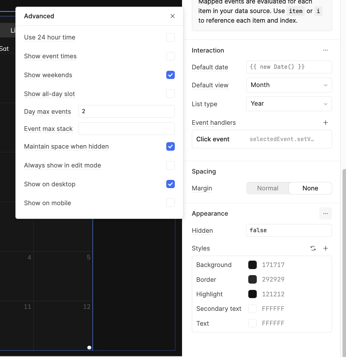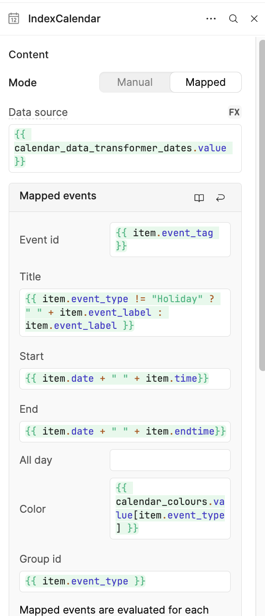 The app is running in embedded mode, with the following config for the calendar