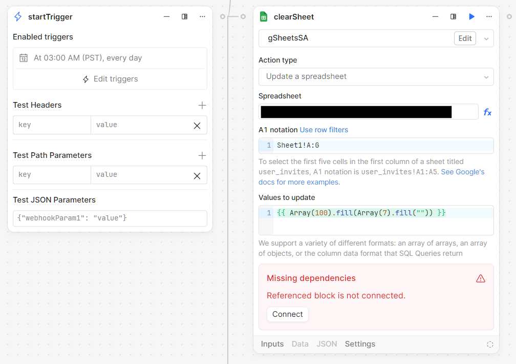 I get a Missing dependences error in the block. If I click Connect, it tries to connect to another block from the workflow (not the startTrigger). There shouldn't be any dependencies, the spreadsheet ID is hardcoded as a string.