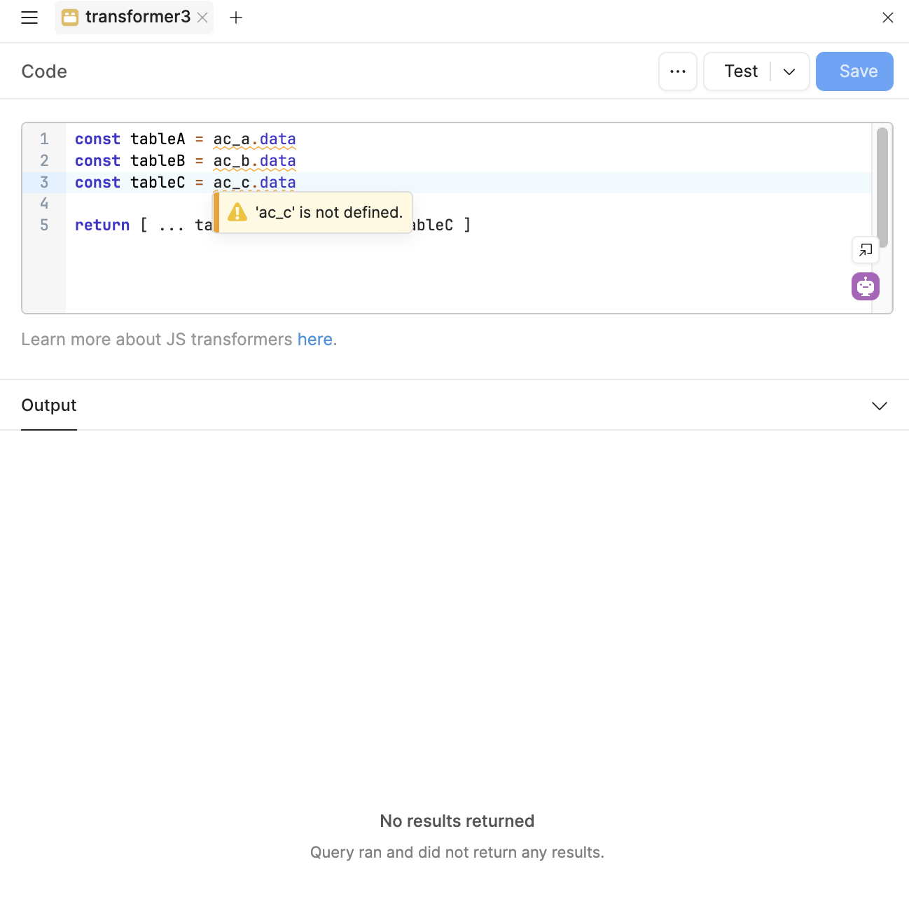 You haven't added formatDataAsArray(data) to your queries' transformers. You can do it directly in the transformer though, e.g. {{ formatDataAsArray(ac_a.data)}}