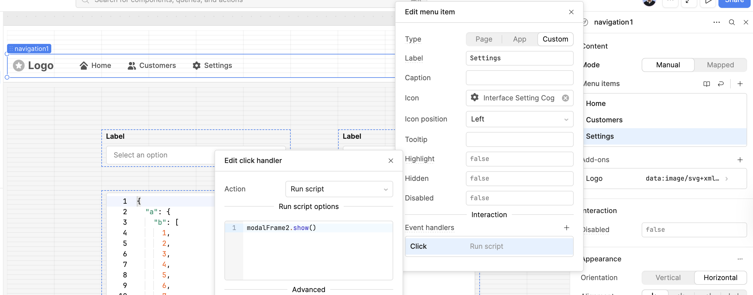 You just have to make sure the modal is scoped globally so it can be reached from any page. In this case, I had manual headers and set the 'Settings' menu item to run the script to trigger modalFrame2.show() which will open said modal.