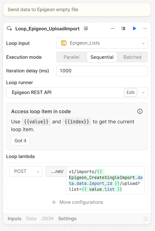 I need to loop through a list of keys (e.g. AAA, BBB, CCC) where, for each key, I first call an API to create an empty file (which returns an import_id) and then immediately call a second API to upload data into that same file using the returned import_id, before moving on to the next key — what’s the best way to set this up in a single Retool Workflow Loop block?