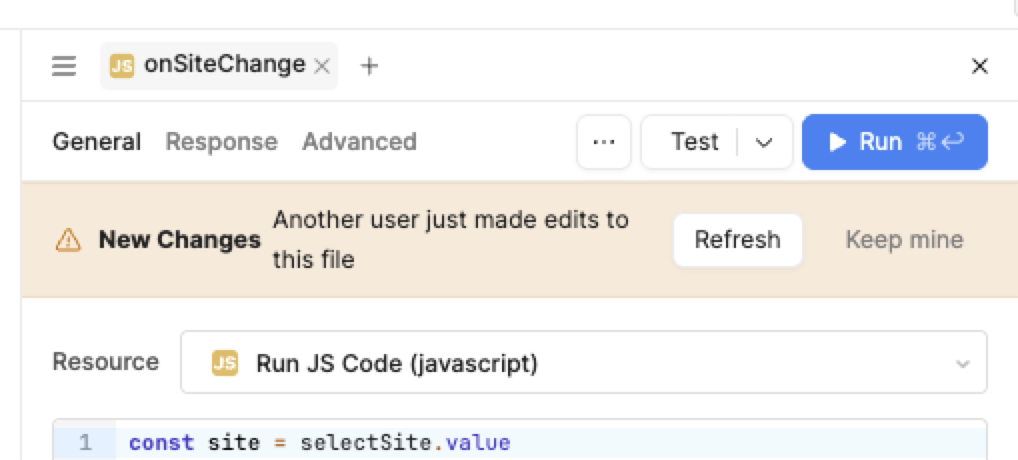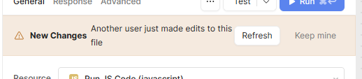 Hey there! I have been getting for two weeks now that “Another user just made adits to this file” on every single JS query that I have across multiple apps. I have confirmed multiple times there is no one else editing it, and also made sure I do not have the app open in another tab. Moreover, just the consistency in which it is throwing me this warning (like every single code as soon as I open edit mode) tells me that this is not due to having someone else there (it sometimes also says the change was made by me). Here is the warning: