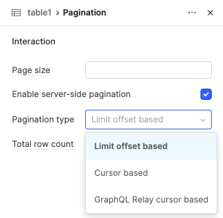 The Table component has built-in support for server-side pagination. In the Add-ons section of the Inspector, select Pagination , then select the box next to Enable server-side pagination . You can then choose to paginate using Limit offset based , Cursor based , or GraphQL Relay cursor based pagination types.