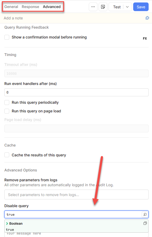 To prevent any of the write/update queries from firing in your app you would want to disable them. To do this you can go to each query’s Advanced tab and add ‘true’ to the Disable Query section: