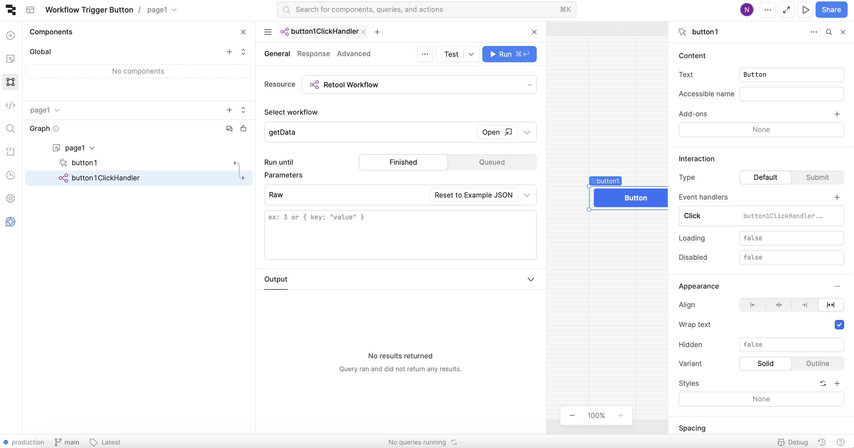 Hi, Iâm trying to build a small app. When I click a button, I want it to trigger my Retool workflow, get a response, and display that response. Instead, it shows {}. When I manually run the trigger, it says: âNo results returned. Query ran and did not return any results.