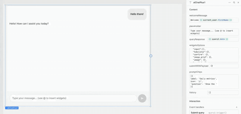 Interactive Chat Interface: Modern chat UI (welcome step, chips) with mentionable interactive custom widgets