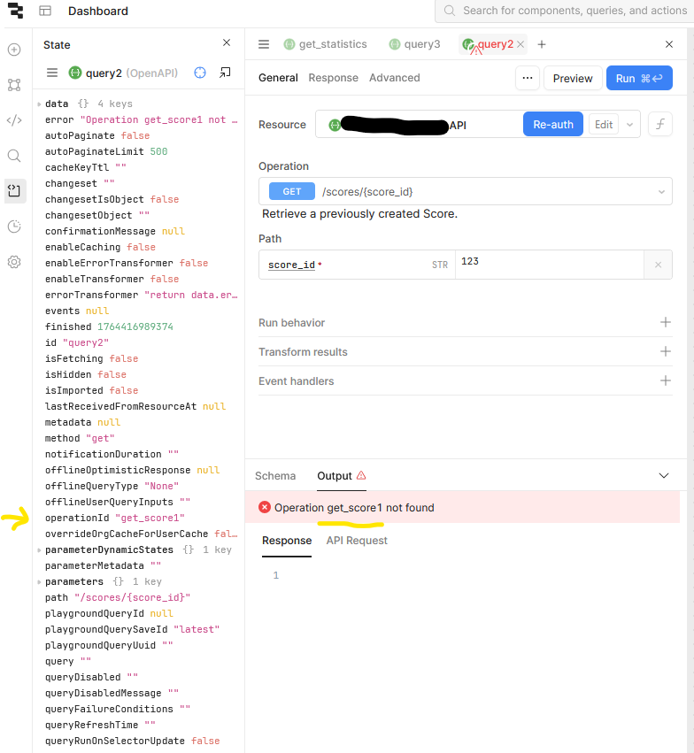 I have created an OpenAPI resource and can successfully retrieve data using the GET endpoints. However, I now have a problem when I create a “Resource query” from an endpoint called “GET /scores/” and when I try to run it I get “Operation get_score1 not found”. When I inspect the state of the query I see a field call operationId that is set to “get_score1”. This is a problem with Retool it seems, no request is actually sent to the server.