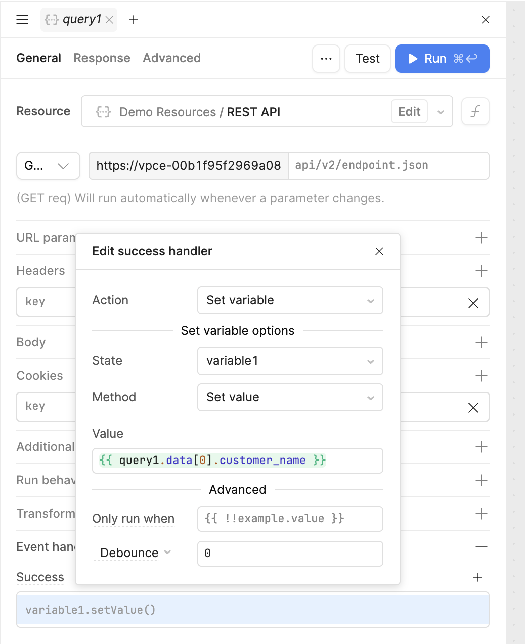In your API query, add an Event handler. On success, set the value of variable1, then use it in your value column when querying.