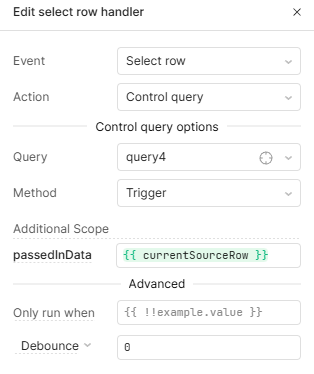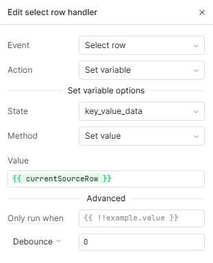 Easiest way here is going to be using the “Select Row” event on the tables you want to update the data in your other component. Some components, like forms, allow you to set the data directly, so your event would look like: