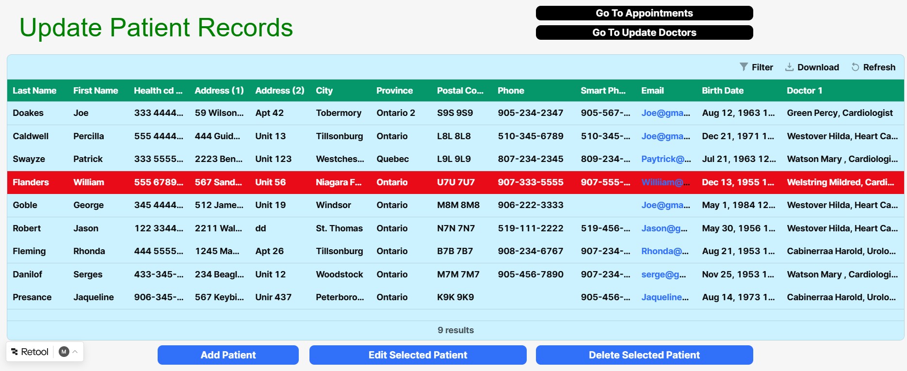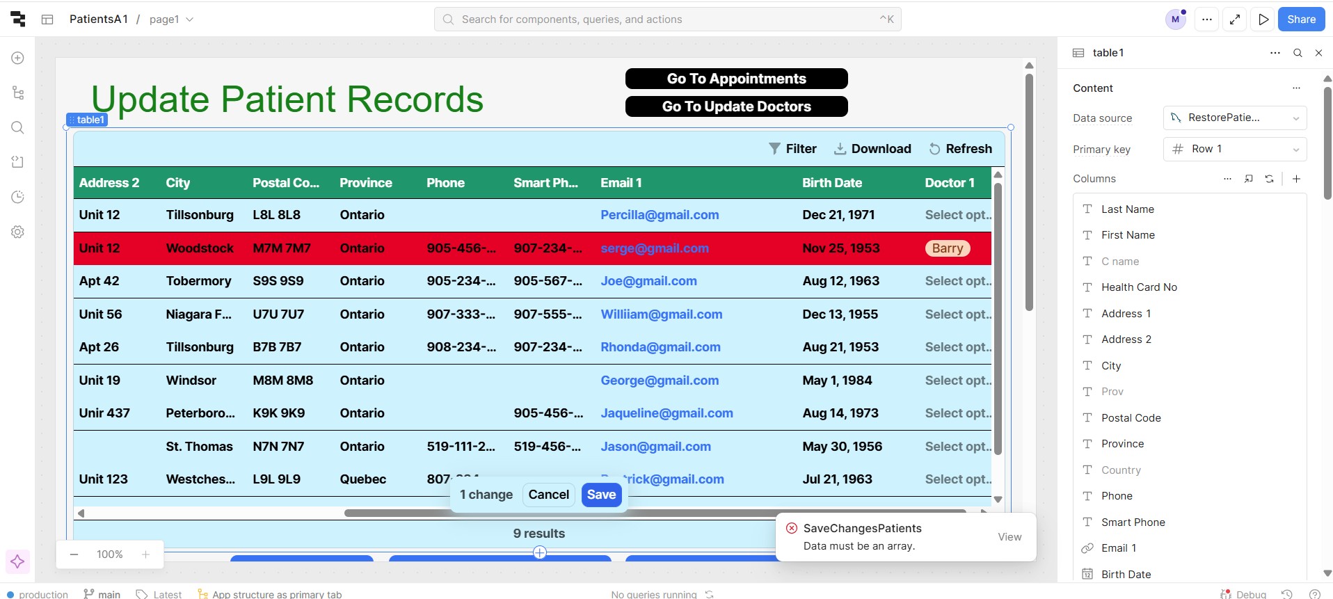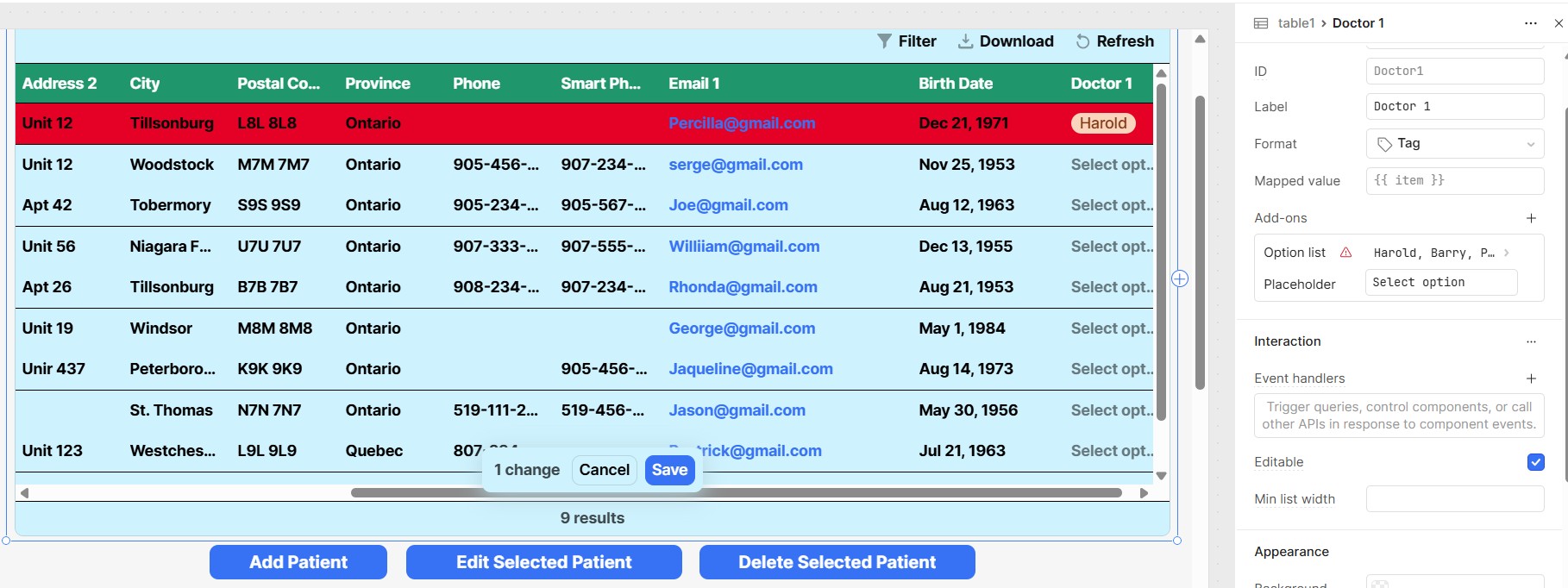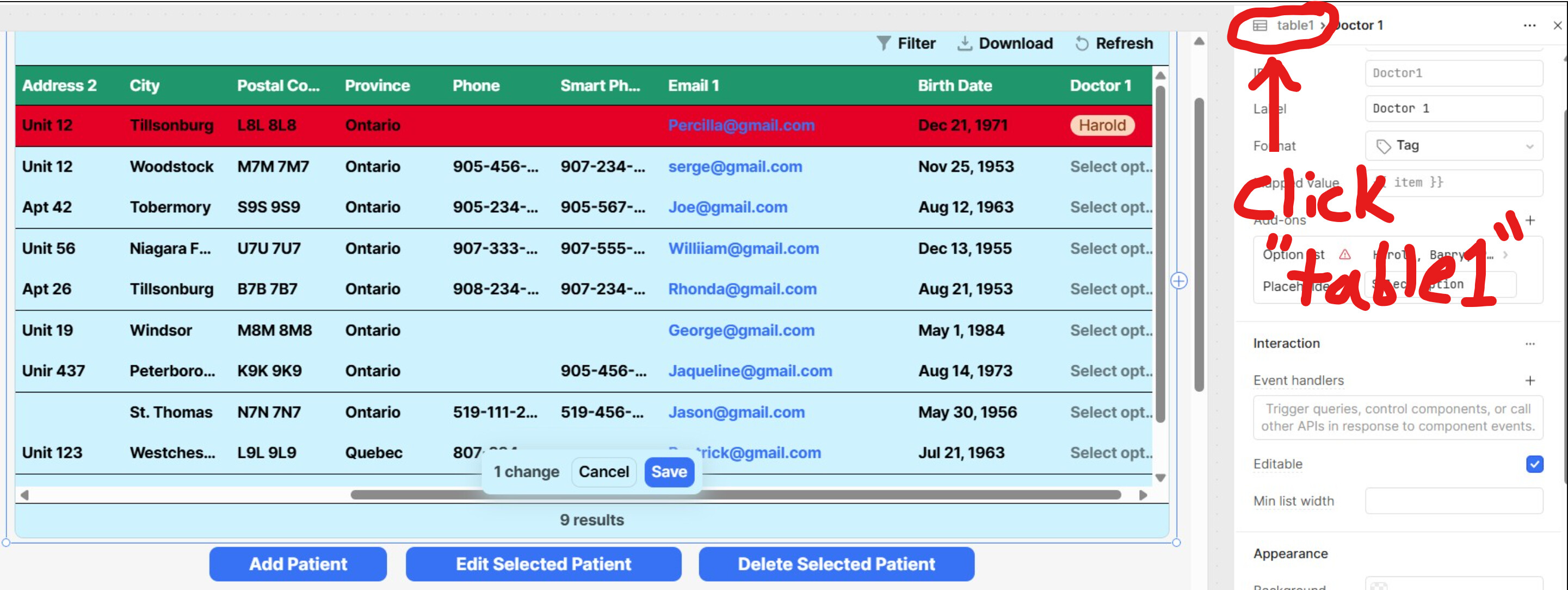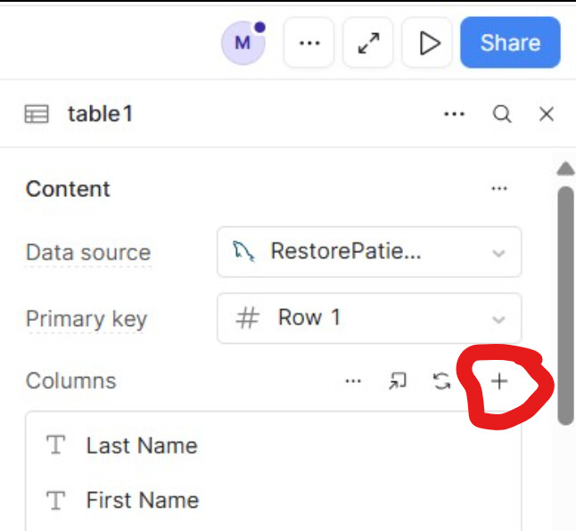 next we need to check that the Retool Table Component matches your database table from cPanel. I can't quite see all the columns in the picture below, but unless there's a hidden one after Birth Date it looks like the retool table is missing the row1 column.