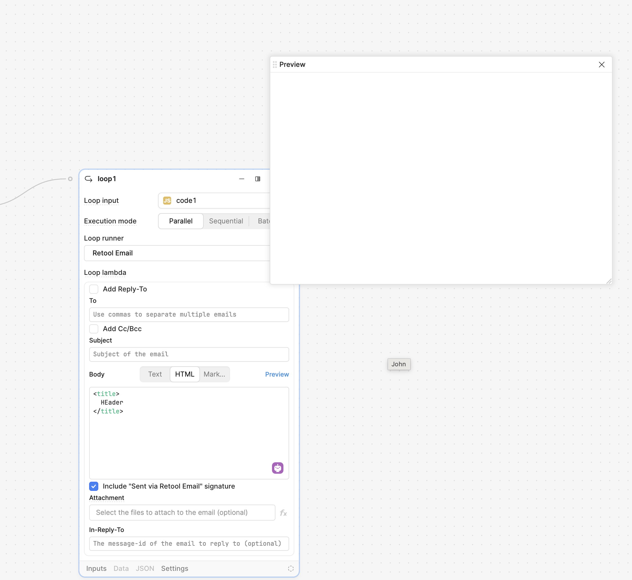 There is a “Preview” feature in the Body of the Loop Block for generating the emails. This seems to be an answer to the problem of late responses to the email client.