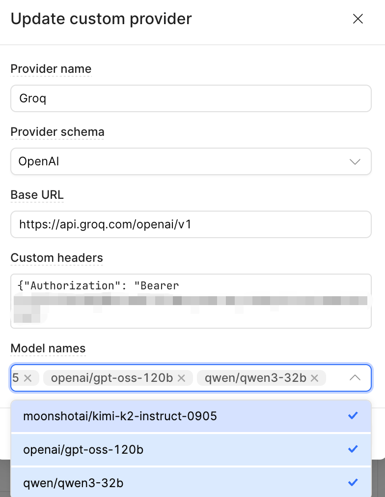 Case 1: I set up Groq as a custom provider and listed several provided models I’d like to try out, but after switching to these models in an existing agent, I ran into errors in the chat interface.