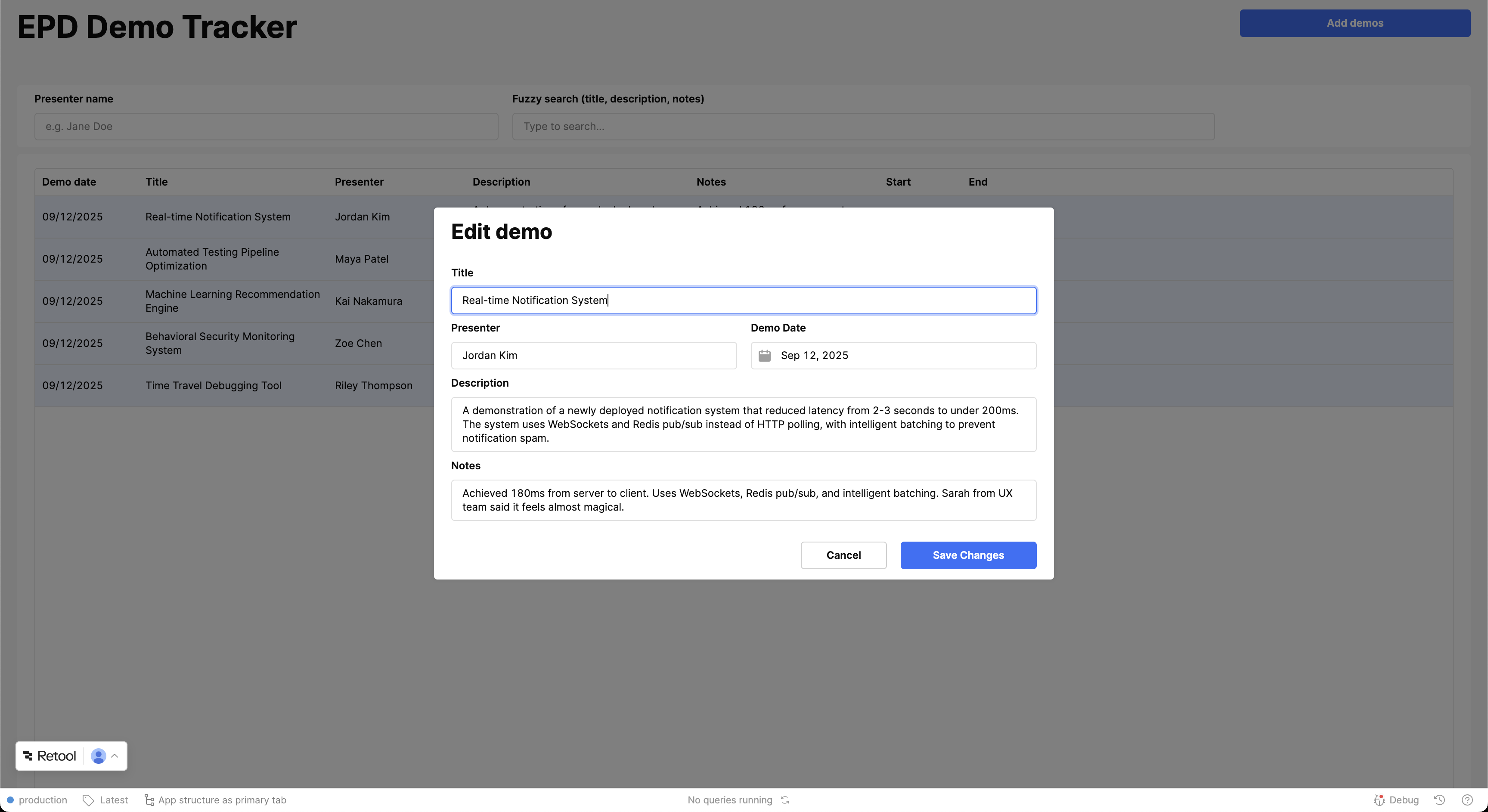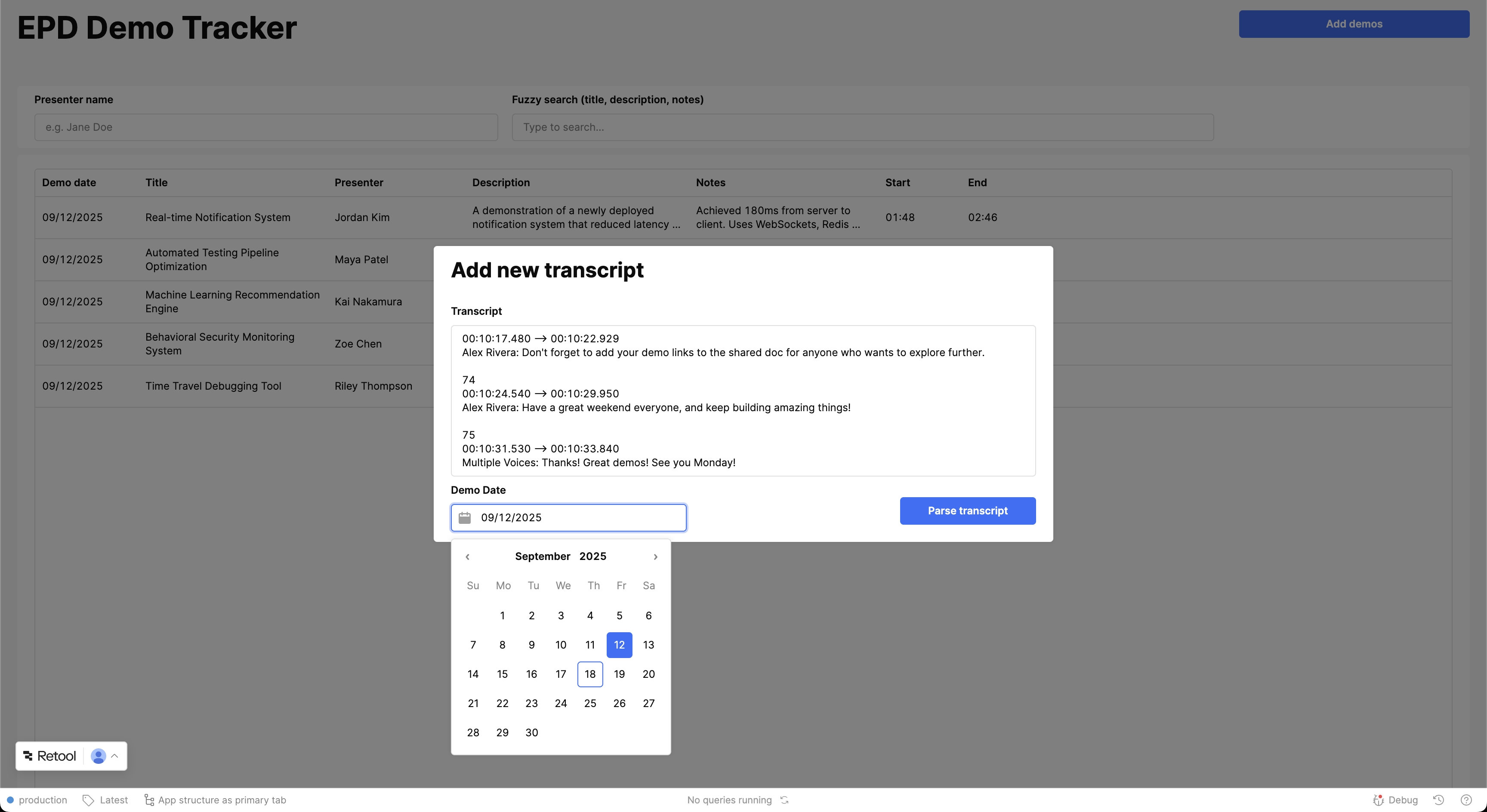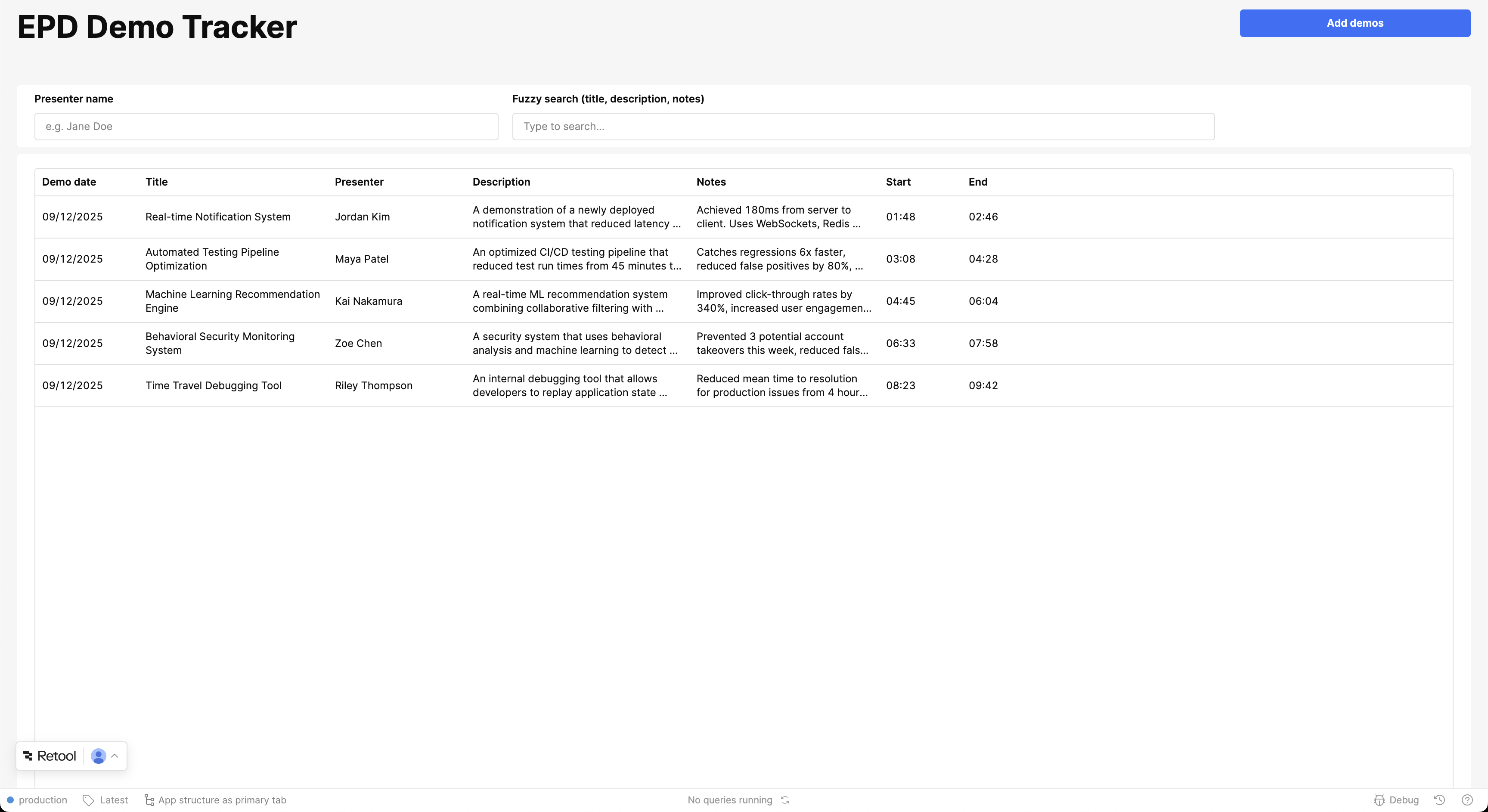 I wanted a tool to keep track of all the fantastic demos our EPD team presents every week.