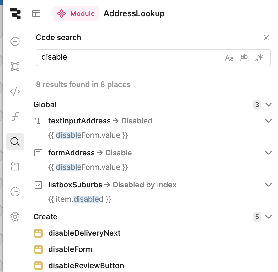 If I search for queries or variables, I can see them, but they are scoped to the page they were in, in the App. The module has no pages, but the scoping appears to remain. In this screen shot, you can see a collection of queries scoped to the Create page in the App they came from… but my module does not have a Create page.