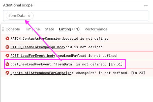 When defining explicit additional scope, it still shows as a linting error in the console, although the code runs fine.