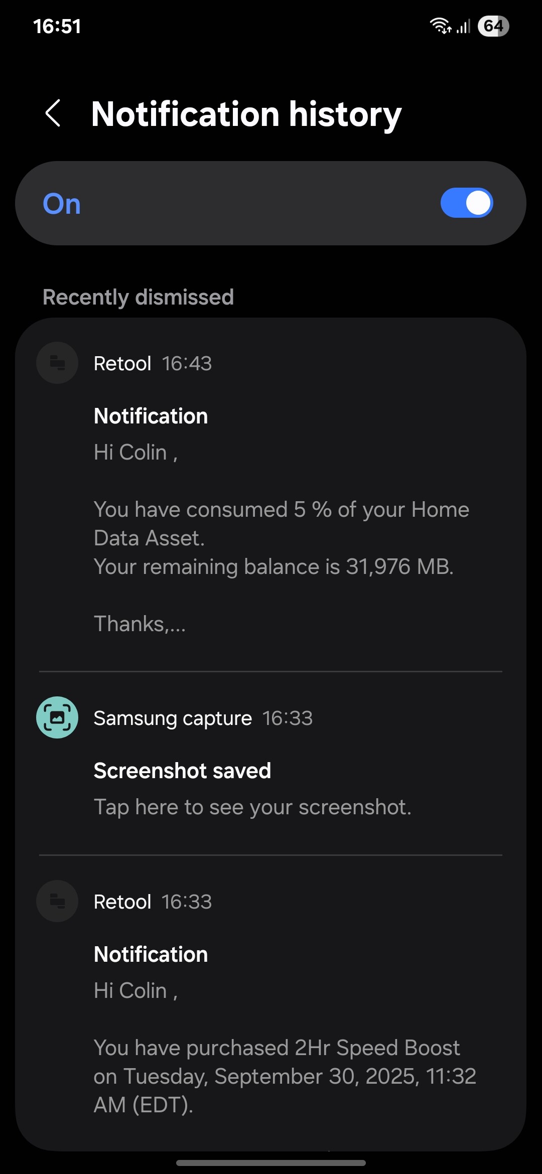 Some screenshots of what I see when the notificiation arrives and I expand it, and then what I see in the notification history which is the full message and also what I see on iOS.