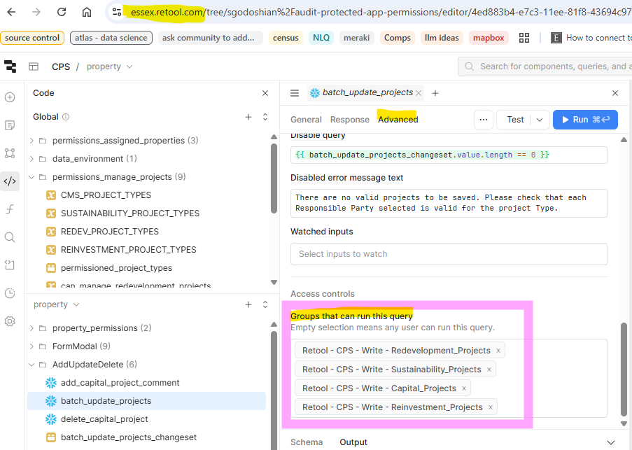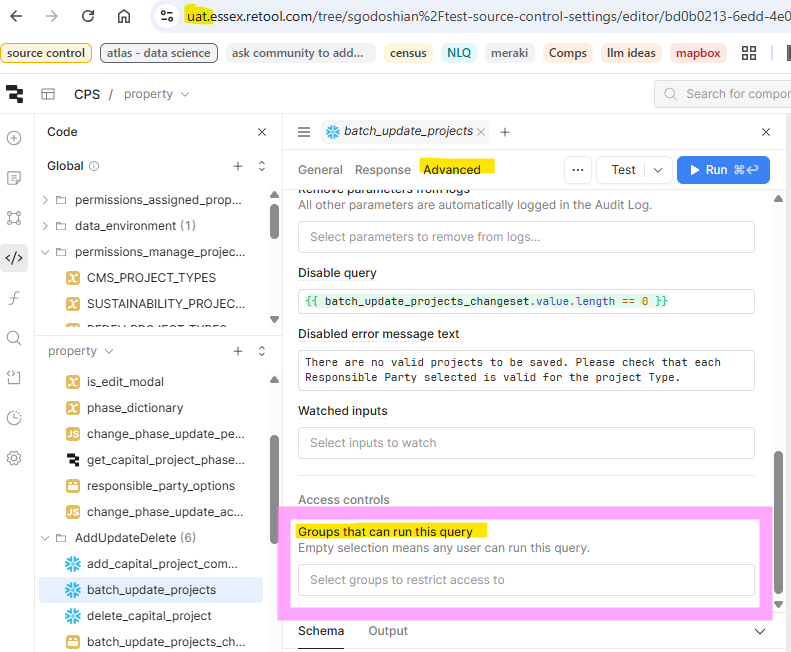 When I protect an app in main and sync it into uat, any Groups that can run this query access controls set on resource queries are removed in uat after I create a branch and make unrelated edits. This appears to happen because permission group IDs are different between spaces, so Retool can't resolve them.
