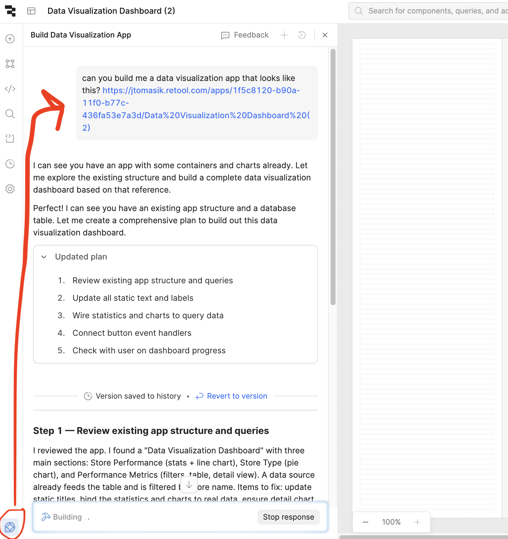 You can open the prompt window from the bottom left blue symbol and provide the AI with a URL link to the app in view mode and ask it to rebuild that app for you.