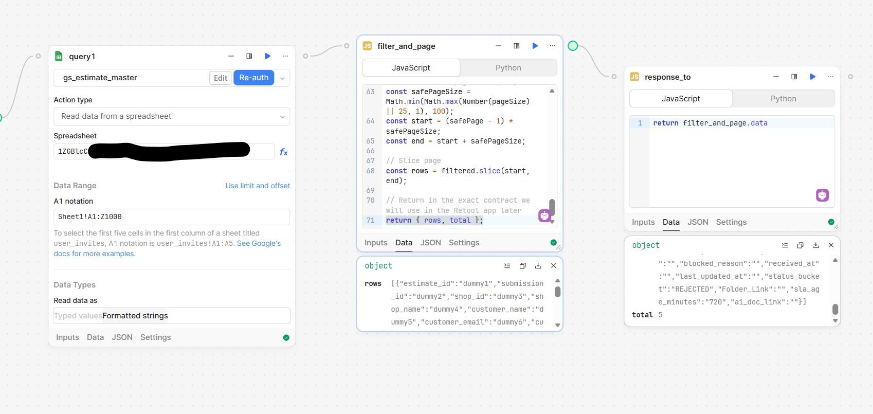 we are pulling data from google sheet to workflow Retool and then push to Retool APP to read it and push it to our table in app. when we choose source data the workflow retool it says source data is empty and when we try the FX .data.rows keep saying undeined and return Null on “.data”
