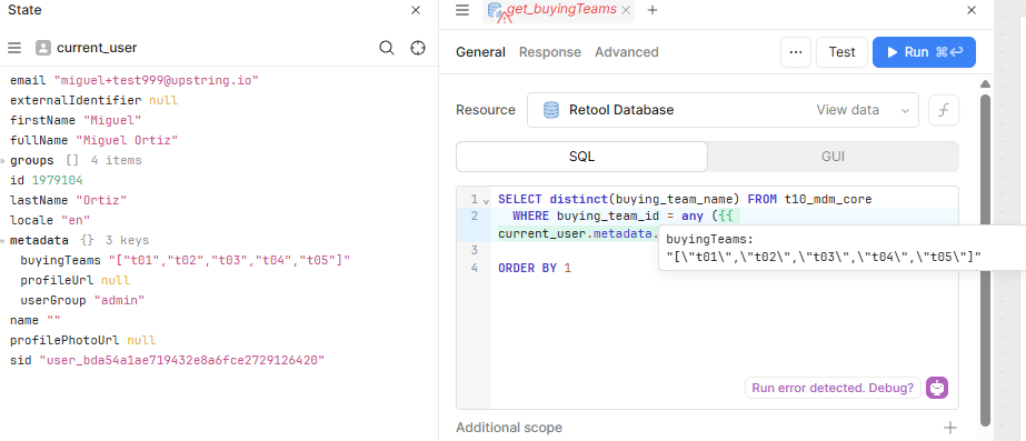 When I look at the user in Retool’s settings, the attribute is properly formatted as JSON:
