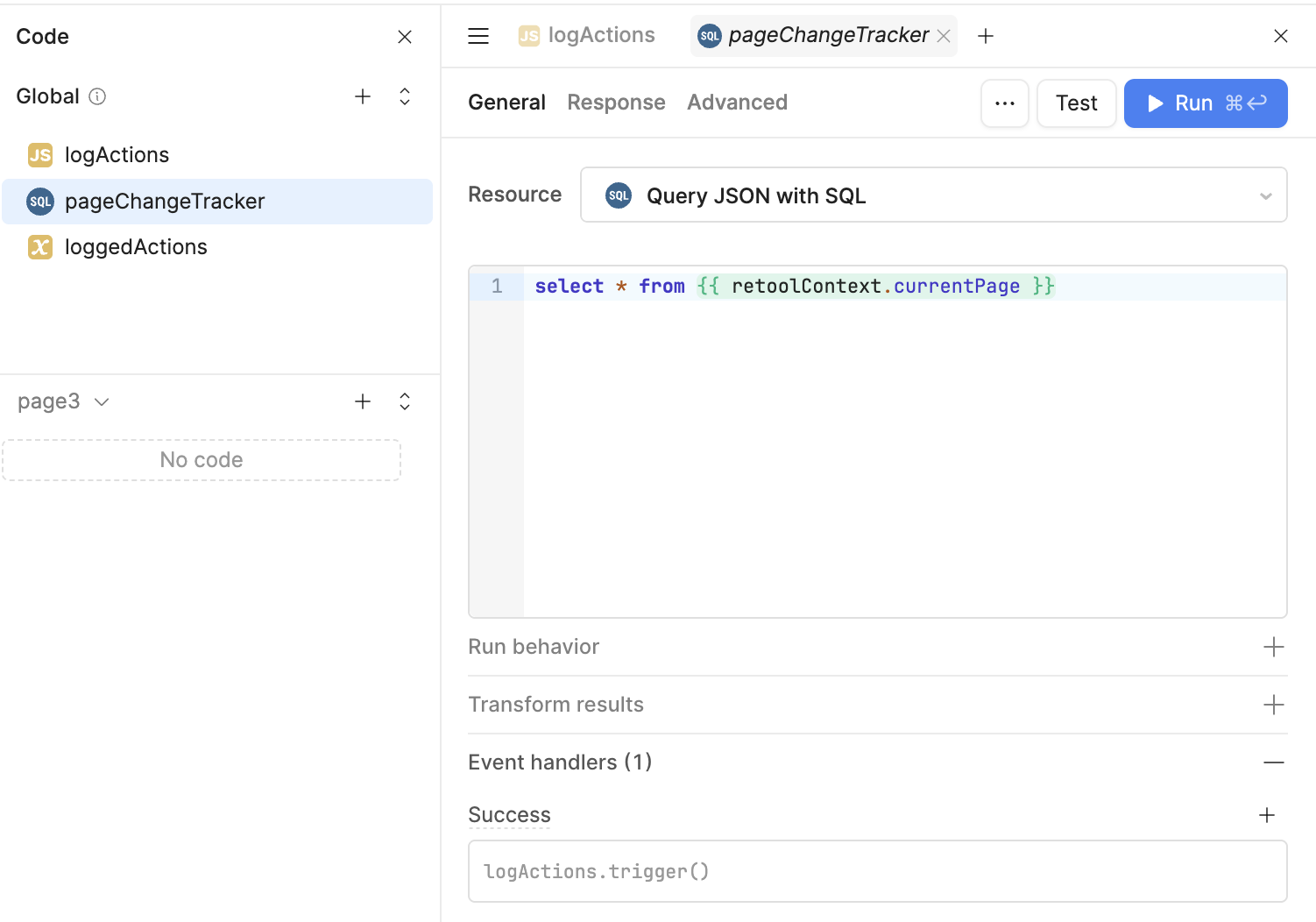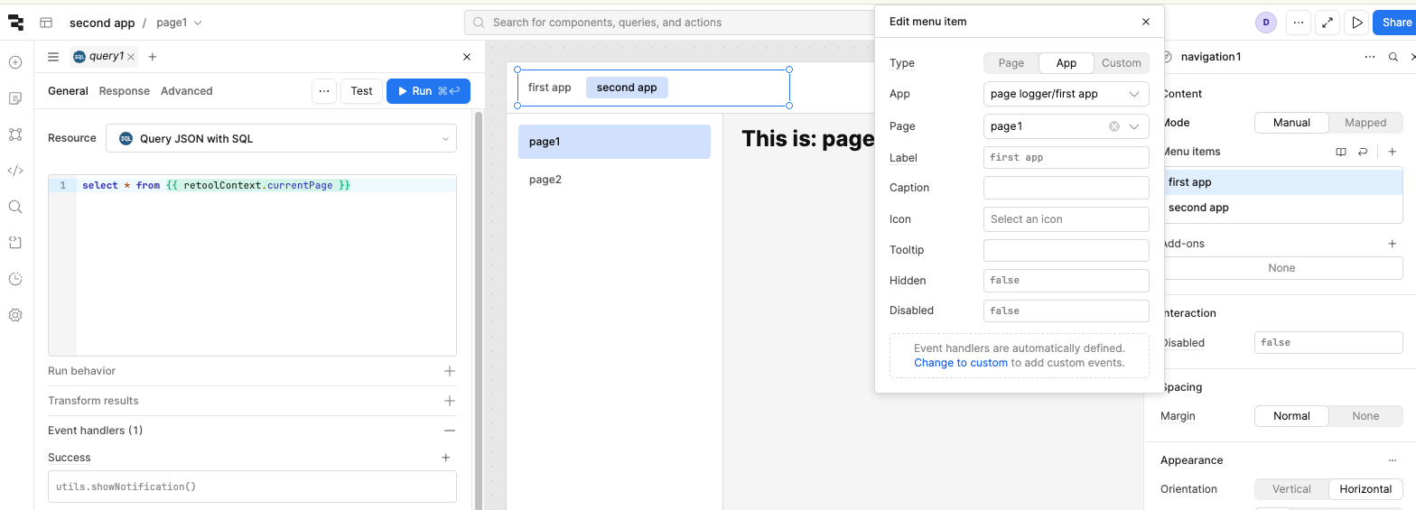 thanks for having a look. Using "Query JSON with SQL" with SELECT * FROM {{ retoolContext.currentPage is a nice workaround to observe the page change event in the global code section. This allows to setup the query only once, which is helpful if an app has many pages and it would be impractical to setup queries manually on every page.