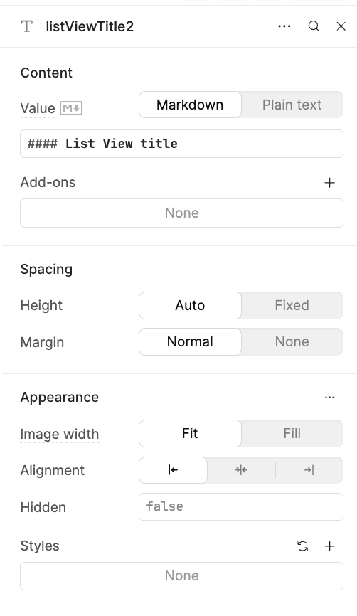 It contains a single Text component (textitem) that repeats for each element in the data source.