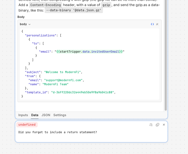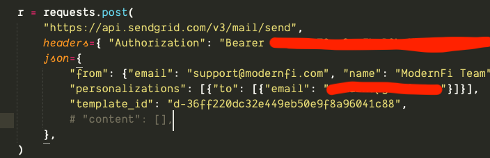 Update here is that when using the SendGrid builder, Retool automatically puts the content field in which when provided with template_id breaks it with the error message you see. In my local test, I can reproduce this by including the line that's commented out. When I comment it out locally, it works, and I get the email, except when I use the JSON body to edit to remove the content param and create an identical payload as what I have successfully working locally it tells me I'm "forgetting to include a return statement." I'm not really sure what this means and can't reproduce it locally so I'm guessing it's a Retool thing?