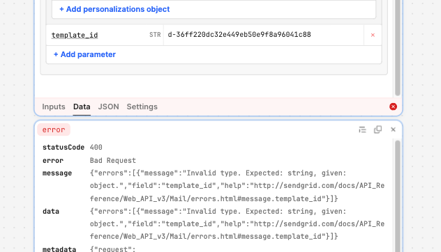 Hi @Jack_T - want to follow up that I'm experiencing a very similar issue. I have a very short python script hitting the SendGrid API working totally fine but when I use Retool's SendGrid resource query, I'm getting a 400 error around the template_id even though it's in there. Do I need to switch to just using REST and bailing on the SendGrid resource?