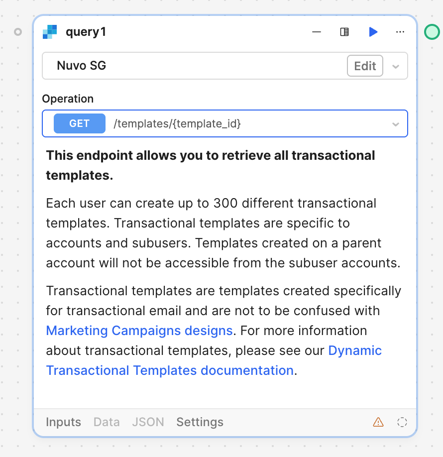 I am not sure where you can find the Retool version that I am using but I looked at the GET /templates/{template_id} endpoint for the integrated SendGrid resource and it still does not have the option to input a template id. Maybe I am not understanding how to use this correctly?