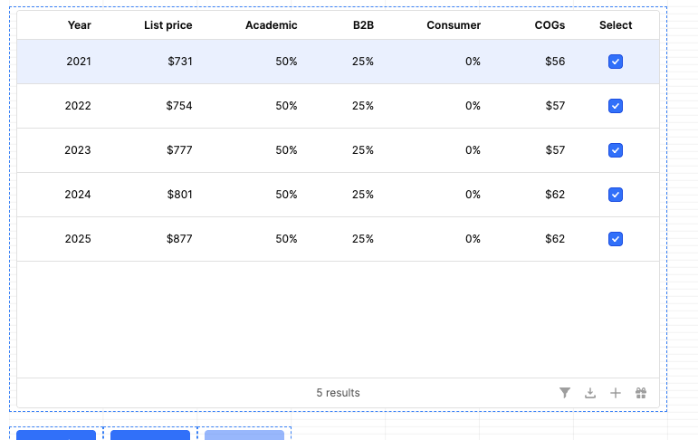 Thanks for you help! I tried the first option but I think I'm missing something about how to get the results of the first query to show up in the table. I've assigned the bottom right button to a query to pull a row from the database as the last row of the table query with the year incremented by +1, then as you suggest on success, query the original data. Only the original data shows up in the table not the new row.