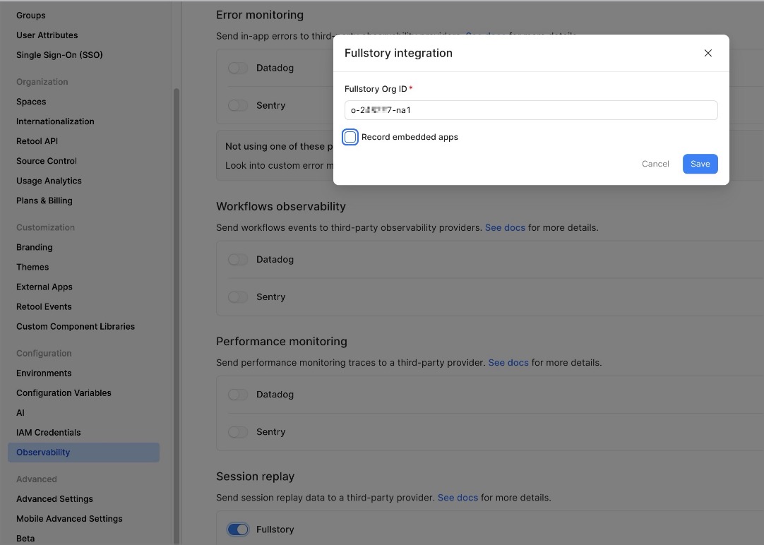 Insert your Retool domain(s) in Fullstory in /settings/capture
