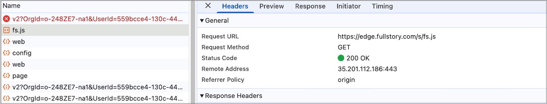 Test this is correctly set up and that FullStory is loaded by refreshing a page (in user mode) and in your DevTools -> Network requests search for fs.js request