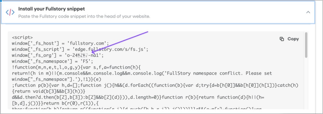 In FullStory under install options open the install your FullStory snippet option to get your org id