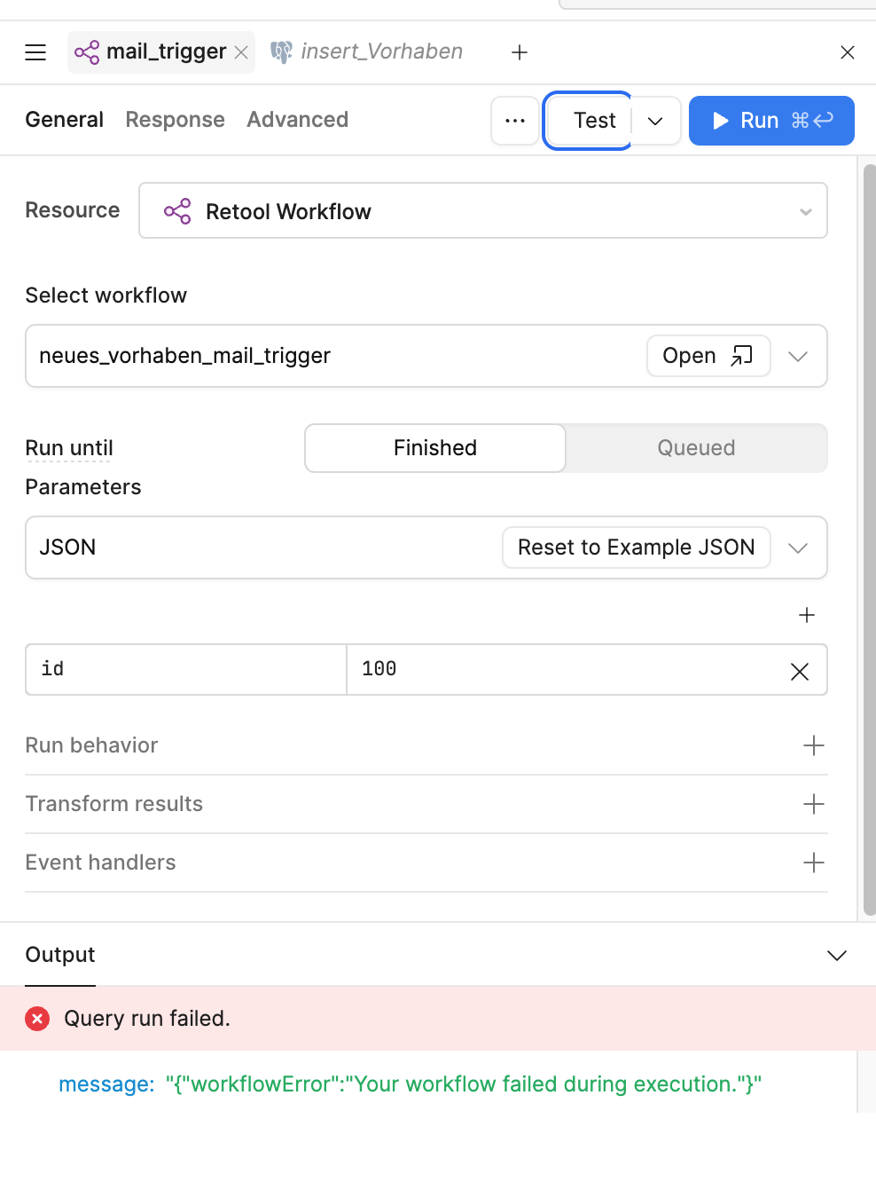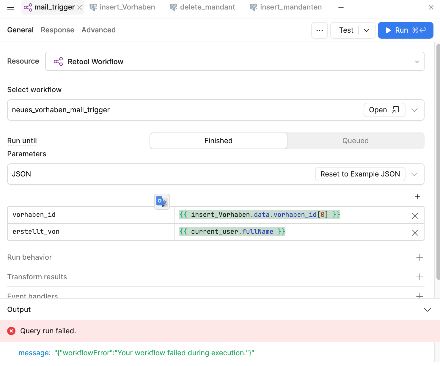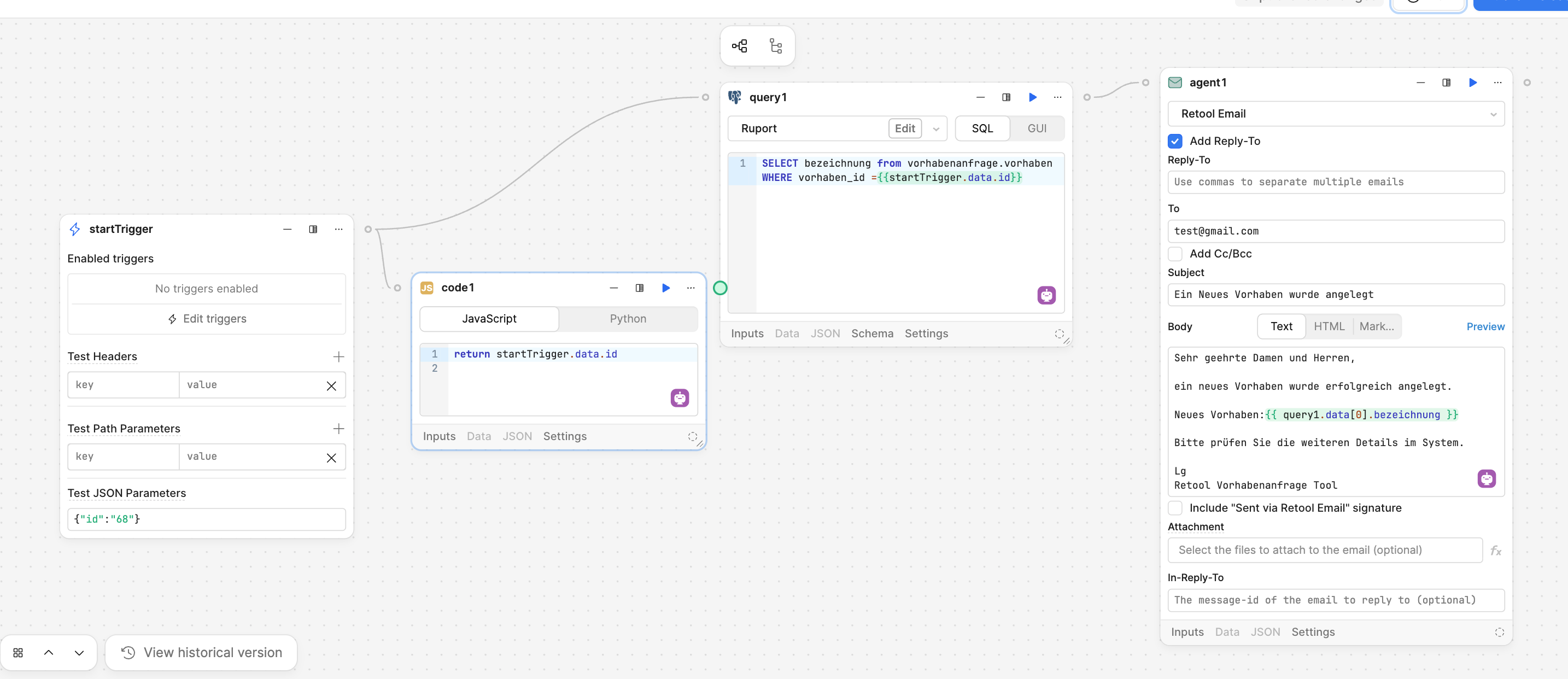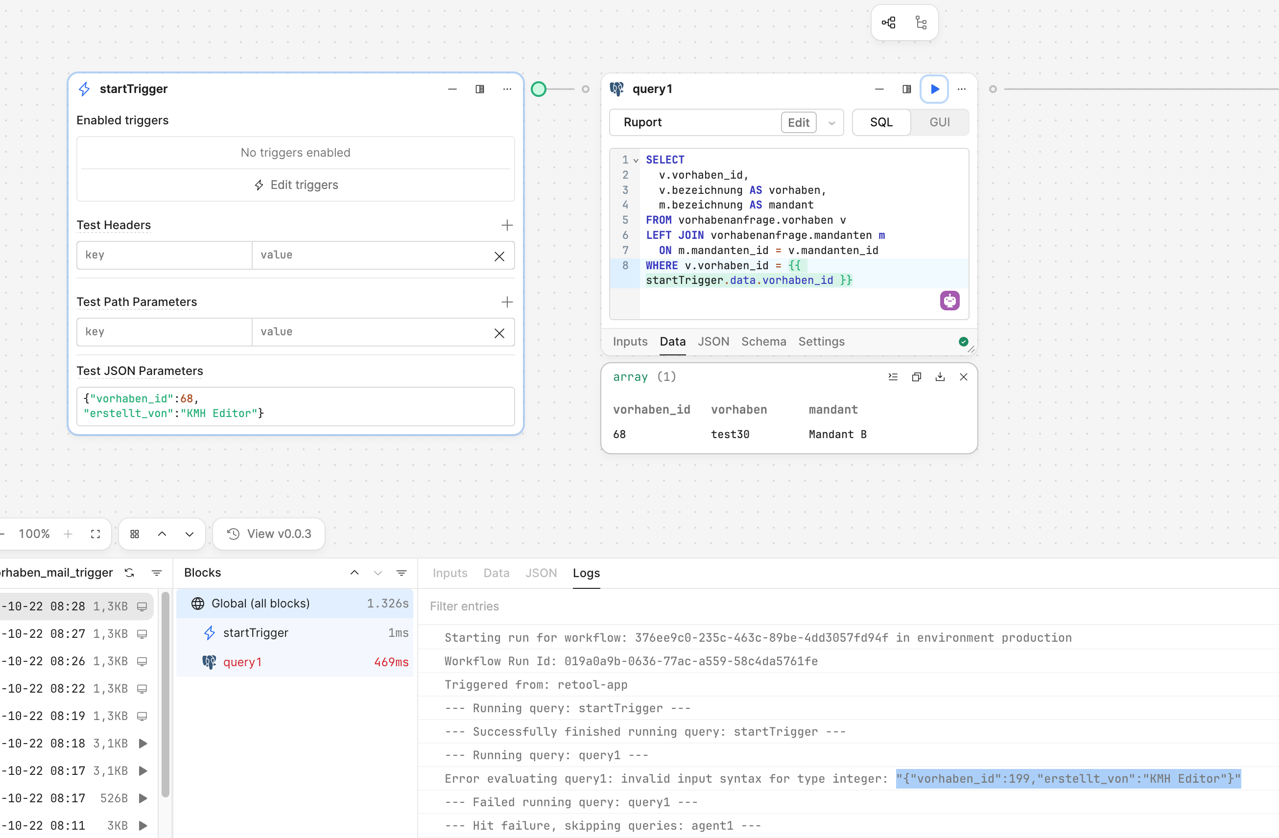 The other possibility is maybe you haven't published your latest changes in your workflow? If a previous version of the workflow was doing something like WHERE vorhaben_id = {{ startTrigger.data }}, and if you haven't published since then, that would explain the error.