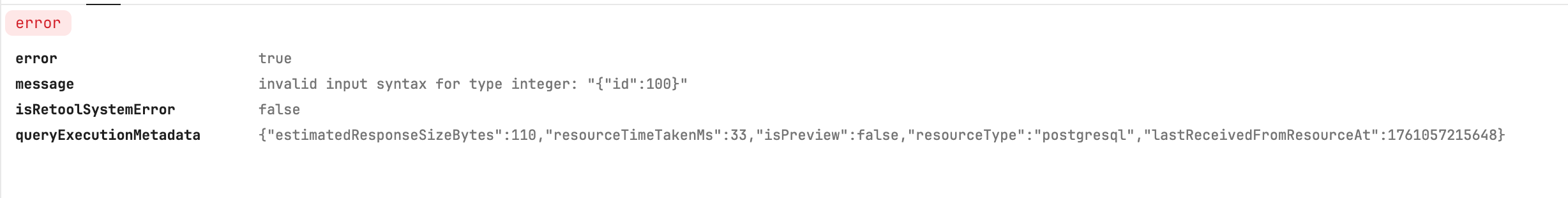 If the workflow or query expects a string (for example, id defined as text or UUID), sending it as a number can cause that type error. Try wrapping it in quotes to match what your workflow expects, like: {"id": "100"}