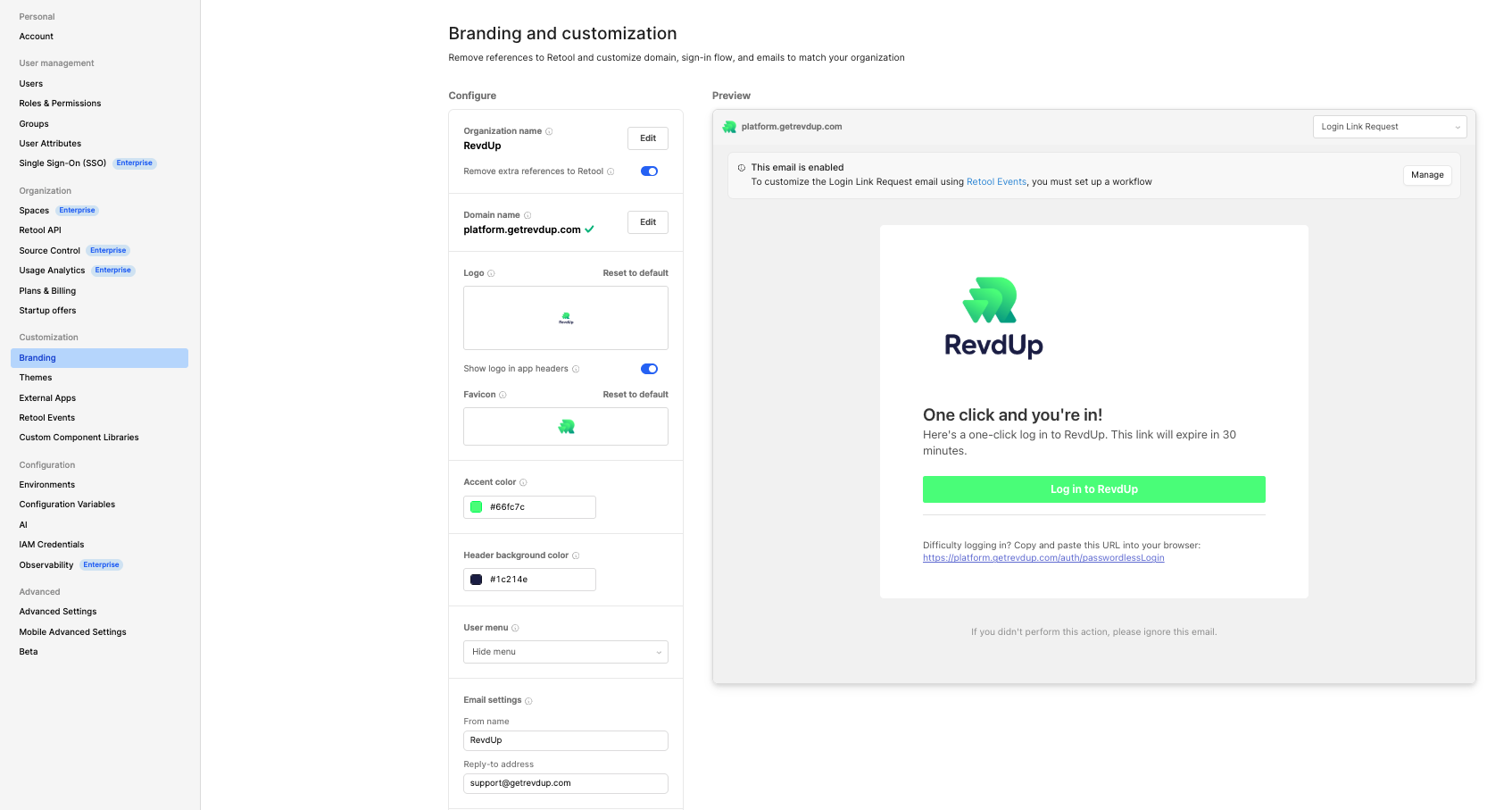 In the Branding settings, the password reset email appears to correctly reference platform.getrevdup.com. However, when a user actually requests a reset link, the email they receive directs them to revdup.retool.com instead.
