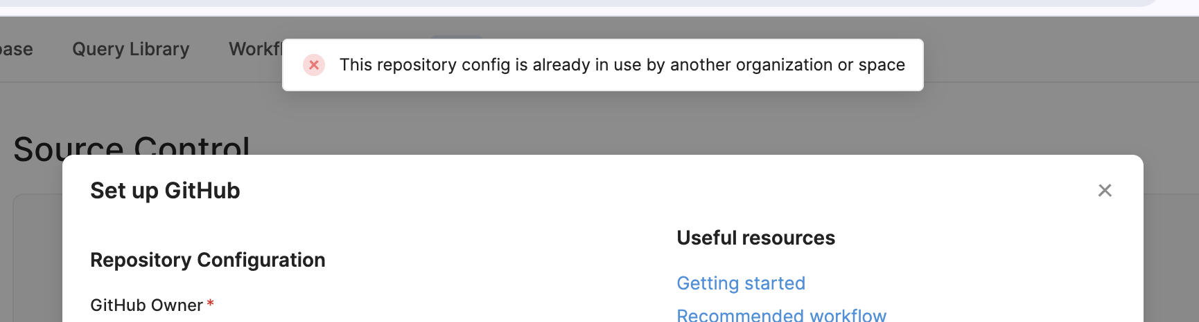 Failed to upsert SCM config: A source control configuration with the same repo