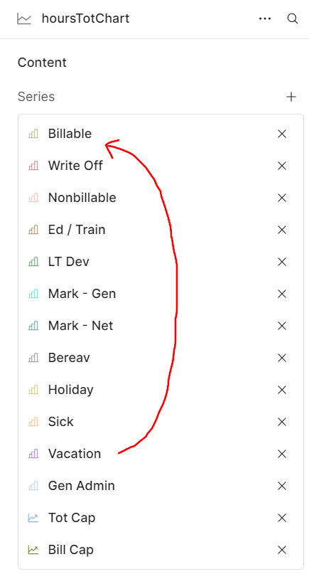 In a stacked bar chart, I have a number of series. I'd like to drag-and-drop the order but I'm not able to. The only workaround I've found is to delete all the series and re-add them in the order I want, but each of the series has some customizations that would make this very time consuming.