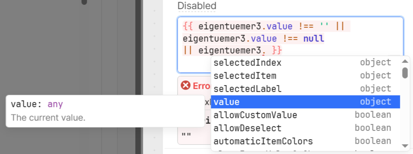 As you see I have a normal syntax for the button but as you can see in the screenshot below the value is shown as any and because of that the syntax I tried isn´t working. - Retool version & hosting setup (Docker, K8s, cloud provider, etc.):