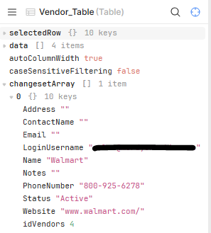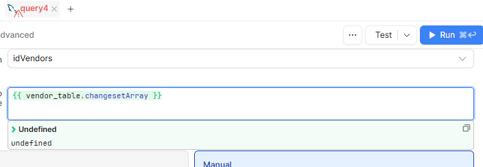 So the variables are case sensitive, and it seems your table is Vendor_Table with caps, so that may be the reason why your query gets that error, as is returning undefined. Can you give it a try with Vendor_Table.changesetArray?