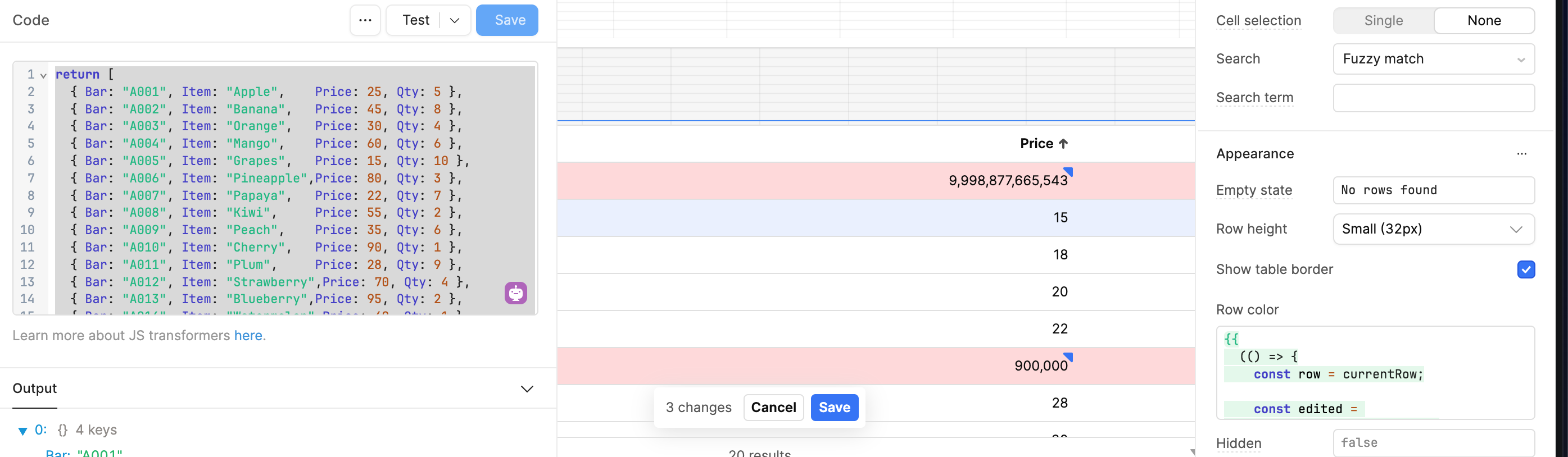 { Bar: "A003", Item: "Orange", Price: 30, Qty: 4 },