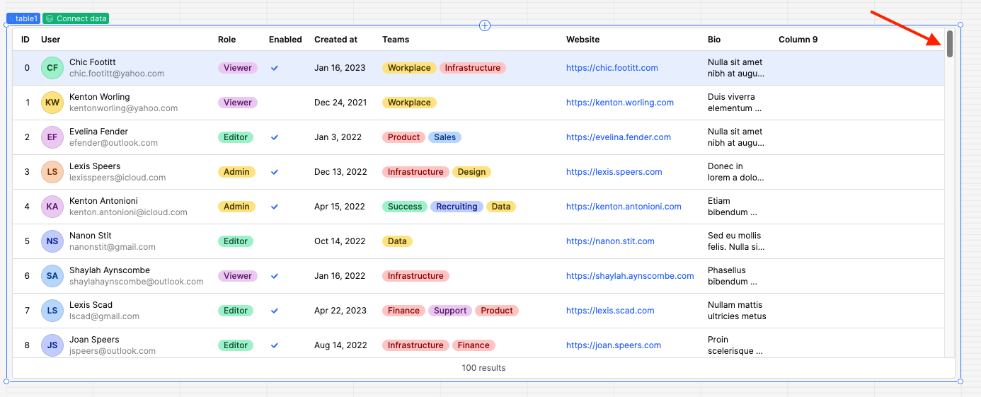 Hey @mpmohi, just a quick update in case anyone came across this topic. The latest Table component now shows up to 100 results with a vertical scroll bar, so you should be able to scroll through them directly in the table. Hope that helps!