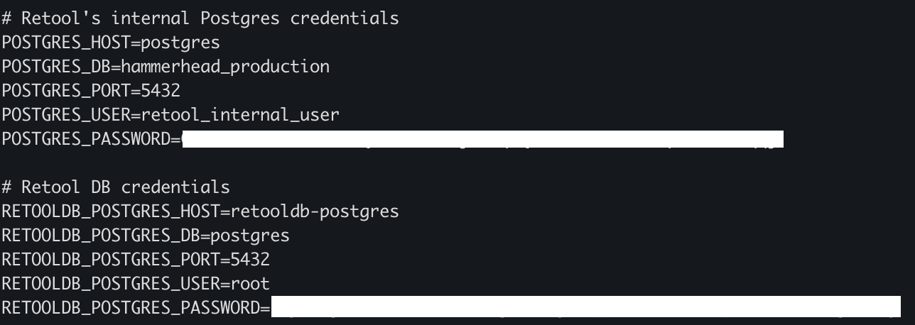 Your docker.env might look a little different, but there are two sets of environment variables that you'll need to update - one for each database.