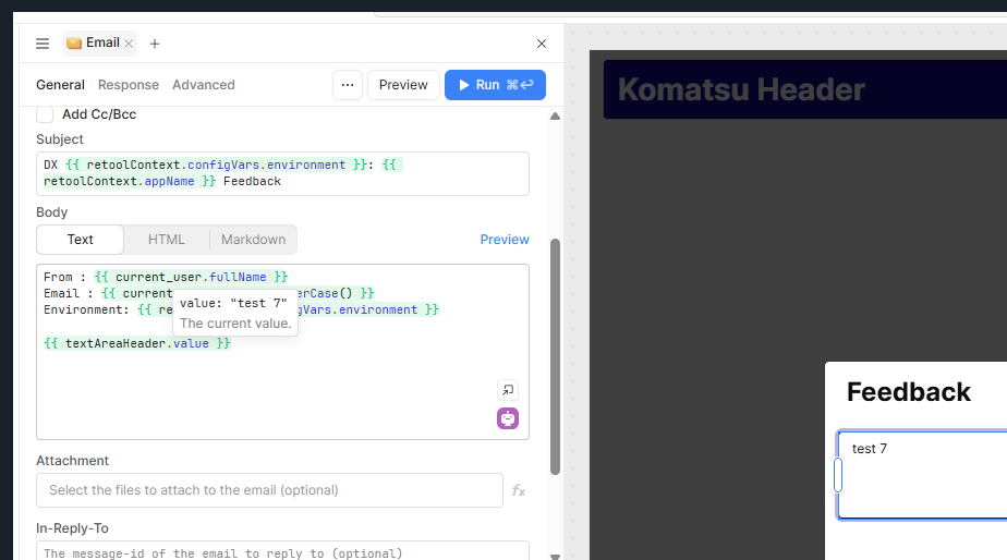I have tried putting other thing after {{ textAreaHeader.value }} and they come through, e.g. I also added {{ textAreaHeader.id }}. It is just the {{ textAreaHeader.value }} that now does not populate in the email - when I put my mouse over it, I can see it has a value.