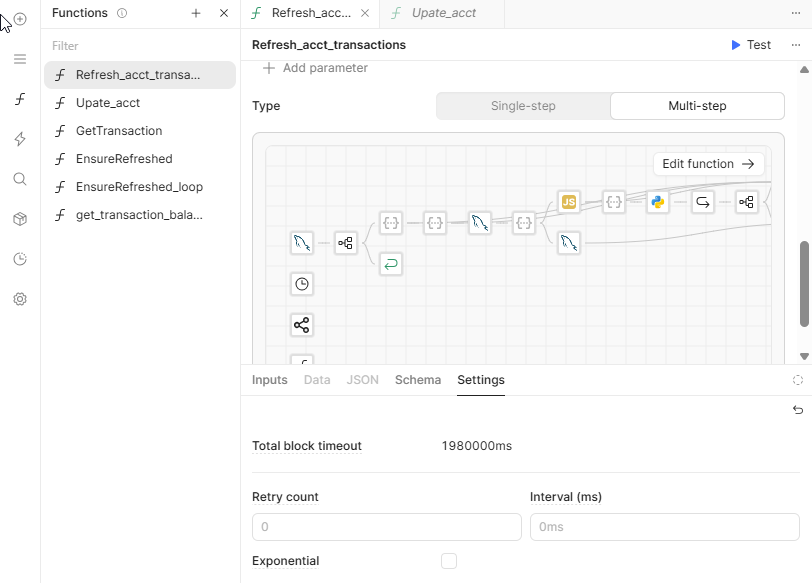 It looks like your multistep function timeout totals up to 33 minutes (1980000ms), and multi-step functions are treated as sync (they time out at 15 minutes). Is it possible the function is running for 15 minutes?